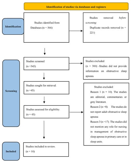 To manage references, to look for duplicates, and eliminate them, EndNote 9.2 was used as a citation management tool. To maintain the precise numbers obtained from each database, the references were exported to the software. After deduplication, the references were exported to Rayyan using the Rayyan tool []. Using the inclusion and exclusion criteria, two reviewers independently examined the titles and abstracts of the references, and any disagreements between them were resolved by consensus. The complete texts of the articles were searched for relevant references. Full-text publications were screened using the same methods as title/abstract screening. Using a custom data charting form recommended by Arksey and O’Malley (2007) [], the authors, title, publication year, country, study design and sample were collected from the publications. In June 2021, the five databases yielded a total of 566 articles. Following the removal of duplicates, 345 articles were selected for screening. Additionally, 300 studies were disregarded because they failed to present results particular to the role of nursing in OSA management. Of the 45 articles which were retrieved fully, only 10 met all the inclusion and exclusion criteria (Figure 1). The articles included were coded thematically and classified according to major themes and subthemes [].
