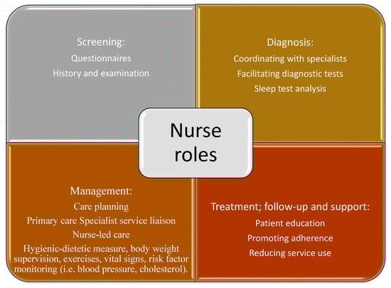 The literature suggests that standards for diagnosis, management, and nurse-led care for patients with OSA have improved over recent years, as well as suggesting that nurses can play a critical role throughout this journey. As a result of the literature review, it appears that nurses play a variety of roles in the diagnosis, assessment, management, and follow-up of patients with OSA. An overview of these roles can be found in Figure 2. This role includes providing high-quality standards of care and expertise in promoting the wellbeing of patients, educating patients and implementing evidence-based practices across all care settings [].