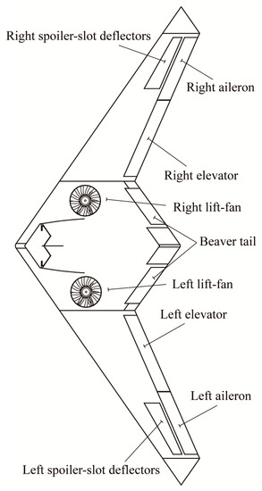 Figure 1 depicts the flying-wing UAV that was utilized in this study. The UAV is equipped with two lift fans and a thrust vector mechanism for pitch and yaw control. The lift fans, which are powered by Li-Po batteries, are positioned at a fixed angle at the front of the fuselage. The thrust vector mechanism, consisting of a turbojet engine and a 3BSD nozzle, is similar to that used in the F-35B [5]. The thrust-to-weight ratio of the UAV, despite having two lift fans, is approximately 0.69. Although the UAV is unable to perform vertical landing as the F-35B does [25], it can accomplish short takeoff and short landing (STOSL) by using its lift fans and vectored thrust. The nozzle pitch angle ranges from 0 to 90°, while the yaw angle ranges from −15 to 15°. The use of vectored thrust is restricted to the takeoff and landing phases, thus resulting in an improved takeoff and landing performance. During cruise flight, the nozzle remains level, and the rear engine door is shut, allowing the UAV to function as a standard flying-wing aircraft.