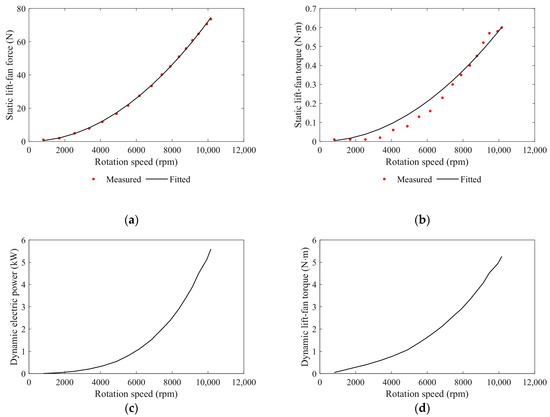 Bench test results for lift fans. (a) Lift fan static force test results and fitting curve; the estimated results are Ct = 4.2278. (b) Lift fan static torque test results and fitting curve; the estimated results are Cq = 0.2303. (c) Recorded dynamic electric power change with rotation speed. (d) Calculated results of the dynamic lift-fan torque.