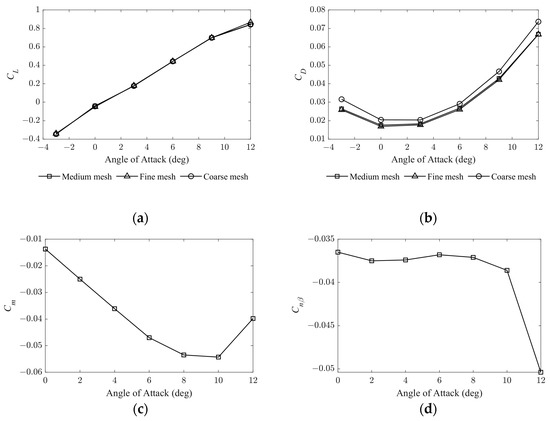 Computational fluid dynamics (CFD) methods are used to determine the UAV’s aerodynamic properties. However, for the sake of computational efficiency, the effects of the lift fans and thrust vector are not considered. Figure 5 displays the pressure contour of the aircraft, and three different grids are employed to check the mesh sensitivity of the CFD calculation: a fine mesh with nodes, a medium mesh with nodes, and a coarse mesh with nodes. In Figure 6a, the lift coefficient, CL, increases with an increase in the angle of attack, but it does not reach the stall region within 12 degrees. The drag coefficient, CD, on the other hand, rises monotonically as the angle of attack increases, as depicted in Figure 6b. It is worth noting that the drag coefficient obtained using the medium mesh is quite close to that obtained by the fine mesh. Therefore, unless otherwise stated in subsequent discussions, most of the results reported below are obtained on the medium mesh.