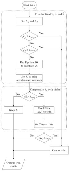 To land the UAV safely, the sink rate, angle of attack, and velocity must be maintained for a steady approach. However, determining the baseline values for these parameters is challenging. To address this, the target UAV is trimmed at various angles of attack, sink rates, and velocities at a height of 50 m under control input restrictions. The trim speed ranges from 17 to 50 m/s, the angle of attack from 3 to 12 degrees, and the target sink rate from 0 to −4 m/s. The lift fan control is split into two parts: balancing the moment from and compensating for , as shown in Figure 8.