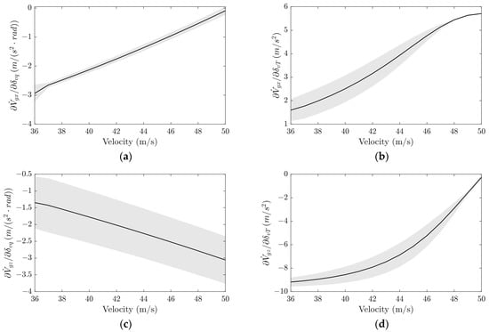 Control input matrix for acceleration (angle of attack α = 4 deg); the gray area is the continuous error bar for various sink rates (0~−4m/s): (a) G11, (b) G12, (c) G21, and (d) G22.