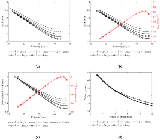 AAS and AMS calculation for short landing (angle of attack = 6 deg): (a) AAS area results, (b) AAS area and AMS results, (c) normalized AAS area and AMS results, and (d) equilibrium points for different sink rates.