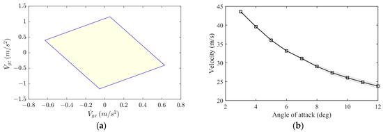 Equation (13) allows the acceleration control matrix to be calculated from trimmed results at different velocities and angles of attack. The attainable acceleration set (AAS) area can be evaluated from this matrix. The AAS area decreases with increasing trimmed velocity and increases with decreasing absolute sink rate, as shown in Figure 11a. In Figure 11b, the AAS area and attainable pitch angular acceleration (APAA) are compared, and they move in opposite directions as velocity increases. The equilibrium point, where the normalized AAS and APAA curves intersect, is shown in Figure 11c for different sink rates. The equilibrium points are calculated at various angles of attack and sink rates in Figure 11d, Figure 12a shows the AAS area [32] for a single trimmed point, with the throttle ranging from −10% to 10% and nozzle pitch angle from −10 to 10 degrees at an angle of attack of 6 degrees, and their mean velocity is presented in Figure 12b with an error bar. The equilibrium curve between the velocity and angle of attack provides the appropriate control command value for flight safety. Therefore, landing at the angle of attack and speed in Figure 12b maximizes the maneuvering margin during landing.