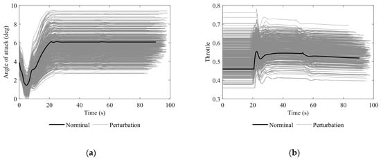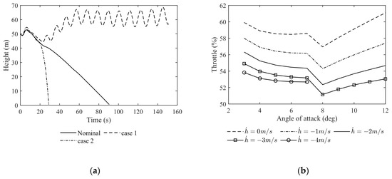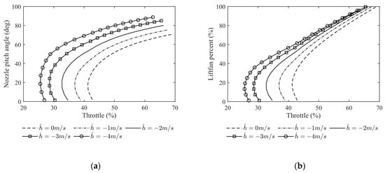 Figure 10 displays the matrix G(·) calculated at a trimmed angle of attack of 4 degrees and various velocities. The gray area indicates a continuous error bar for the changing sink rate. In Figure 10a, tangential acceleration shows a negative correlation with the nozzle pitch angle, indicating that the UAV gains more deceleration capability as velocity decreases due to the larger trimmed nozzle pitch angle. In contrast, the throttle shows a positive correlation with tangential acceleration, which gradually weakens as the velocity decreases in Figure 10b. The nozzle pitch angle and throttle both exhibit a negative correlation with the normal acceleration in Figure 10c,d. The sink rate significantly affects the control efficiency for normal acceleration when using the nozzle pitch angle. The throttle shows better control for normal acceleration than the nozzle pitch angle. Overall, for better control effectiveness, it is preferable to use the throttle to control Vgz and the nozzle pitch angle to control Vgx, despite the control coupling phenomenon between the two.