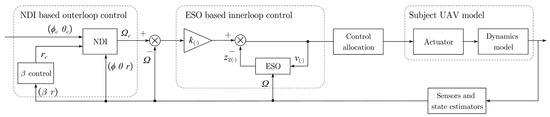 To control the angular acceleration around the UAV’s body axis, an ESO-based control law is designed, where w(t) is the derivative of f(∙) that is unknown but bounded. An ESO is capable of estimating the lumped disturbance caused by external disturbances, unmodeled dynamics, parameter variations, and complex nonlinear dynamics [33]. Dynamic compensation is then used based on the estimated results to linearize the model. For roll, pitch, and yaw control, a second-order linear ESO is designed, and the observer is expressed as follows: