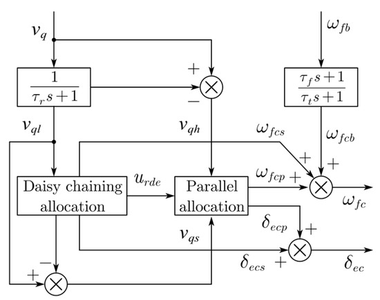 where Clδa is the control derivative of the aileron. The control allocation, Equation (26), does not consider the coupling effect between the SDD and aileron, as it is treated as a disturbance that can be estimated by the ESO. The control allocation for the pitch channel involves both aero surfaces and lift fans, which differ from the roll and yaw channels. Due to the distinct response characteristics of the elevator and lift fans, both a high-frequency and low-frequency control allocation for the pitch channel are carried out, as illustrated in Figure 15.