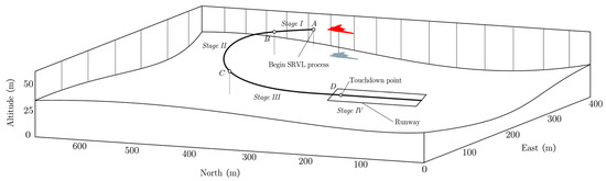 Thrust vector control has been extensively researched, with several notable advancements. Integrated thrust-vector (ITV) control technology has been widely used in post-stall envelope expansion by implementing the engine nozzle [1]. In history, there have been attempts to apply thrust vectoring for the takeoff and landing of the Harrier aircraft [2,3]. The Lianistry of Defence has led the development of shipborne rolling vertical landing (SRVL) technology for F-35B carrier aircraft landing, and thrust vector control has been applied to improve the performance of a damaged fighter [4]. The F-35B is well-known for its short takeoff and vertical landing (STVL) capabilities [5], which are supported by thrust vectoring technology. Additionally, the UK Ministry of Defence [6,7] has improved the payload performance of weapons—as this was previously a weak point for vertical landings—through the use of thrust vectoring. On 13 October 2018, British pilot Peter Wilson successfully completed the first SRVL flight [8], landing the F-35B 755 feet above HMS Queen Elizabeth’s ski-jump deck, and then taxied 175 feet before using the aircraft’s brakes to bring it to a standstill from 40 knots. Compared to vertical landing, SRVL lands at a slow forward speed and uses wing lift to supplement the propulsion system. Reference [9] developed the optimal trajectory transition controller for a thrust-vectored V/STOL aircraft. In Reference [10], the problem of the short takeoff curve was solved with the optimal tilt angle optimization. Different from the straight-line approach [11,12] taken by the F-35B in SRVL, Nicolas et al. [13] used a curved approach with a fixed-wing UAV and evaluated the predefined spline path, using flight tests. Furthermore, fast transition maneuvers along curved trajectories can reduce landing times [14].
