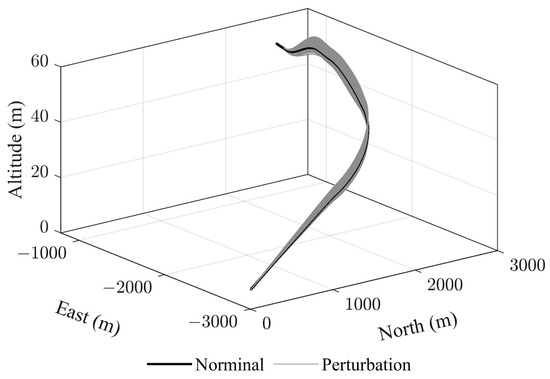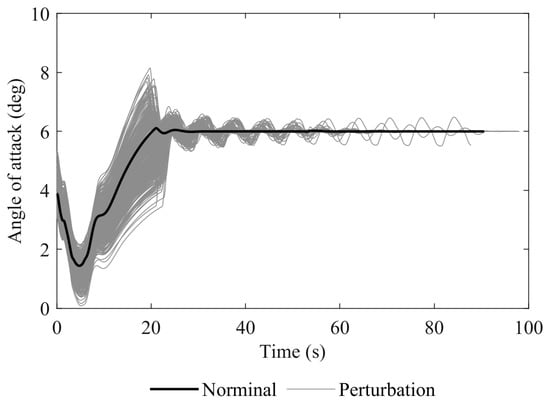 The results in Figure 9 show that the reachable area decreases as the angle of attack increases, and the velocity boundaries move to the left. As the angle of attack increases, the speed boundary decreases, allowing for a lower flight speed for the approach. However, a lower speed comes with a reduced maneuvering area, which increases the risk of the approach phase. Therefore, a balance must be made between the landing speed and flight safety, and the proper angle of attack and flight velocity must be selected during the short landing.