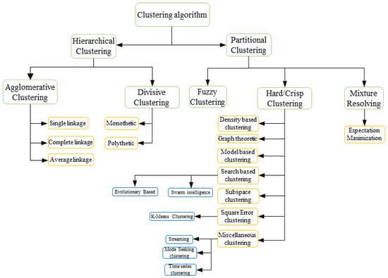There are two broad categories in clustering algorithms: the first is a partitional clustering algorithm and the second is a hierarchical clustering algorithm [,,,,,,,,]. Agglomerative and divisive methods are further subdivisions of a hierarchical clustering algorithm. The hard or crisp clustering method, the fuzzy method, and the mixture method are three subcategories of the partitional category. There are seven main groups under the hard or crisp: search-based methods, graph-theoretic methods, density-based methods, model-based methods, sub-space methods, miscellaneous methods, and the square error as displayed in Figure 1.