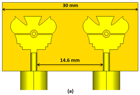 Another arrangement of the two MIMO radiators is utilized to investigate its influence on impedance-matching performance. The new arrangement is accomplished by putting the two radiators face-to-face within a constrained area of 15 × 30 mm2, so the shortest distance between the two radiators is 5.7 mm, as demonstrated in Figure 5a. The outcomes of the face-to-face two-port MIMO antenna are shown in Figure 6a, and it is clear that the antenna covers the same frequency range (6–11 GHz) with S11 = −21.5 dB at 7 GHz. Furthermore, the mutual coupling between elements is less than −18 dB over the obtained frequency band. In order to investigate the effect of the isolation stub used before, it will be inserted between the two radiators on the top and bottom sides of the substrate, as depicted in Figure 5b. It is evident from the outcomes in Figure 6b that the antenna radiates in the range from 6 GHz to 11 GHz efficiently, with a significant improvement in the mutual coupling between radiators of less than −20 dB over the achieved frequency band. As well, the realized gain and the radiation efficiency with and without the decoupling stubs are displayed in Figure 6c,d, which show that the antenna has gain fluctuated between 1.5 dBi and 3.3 dBi for both cases while the efficiency fluctuates from 80% to 90% with stubs and from 92% to 95% without stubs.