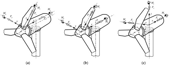 Coordinate systems for different loads: (a) Coordinate system for blade loads; (b) Coordinate system for hub loads; (c) Coordinate system for tower loads.