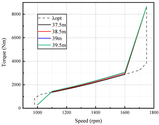 Due to the extension of the blades, the generator torque-speed curve of the turbine should be adjusted to track the optimal tip-speed ratio. In the original model of the wind turbine (without blade extension), the torques are determined by a look-up table way in GH-Bladed. As is shown in Figure 3, a linear transition is adopted in the phases with minimum or maximum rotational speed. Specifically, in the cut-in phase, generator torque-speed curve is set to linearly increase to the 1200 rpm, and when the generator speed reaches 1600 rpm, the generator torque-speed curve is set to linearly increase to the maximum generator torque. Between the two linear parts of the curve, the wind turbine will track its optimal tip-speed ratio and the generator torques are given by:
