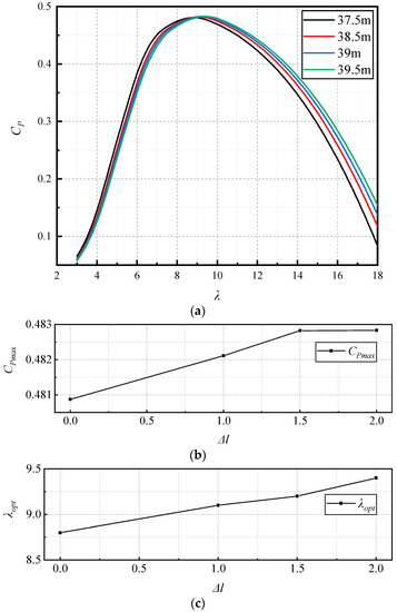 Variation of CP: (a) CP-λ curve of turbines with different blade lengths; (b) Variation of CPmax with the blade extension length; (c) Variation of λopt with the blade extension length.