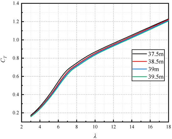 Figure 5 shows the CT-λ curves of turbines with different blade extension lengths and the original design. As shown in Figure 4, the thrust coefficient decreases with the blade length.