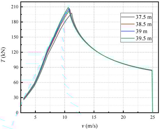 The wind speed and thrust coefficient under the maximum thrust force for different blade lengths. The variation percentage in the parenthesis is calculated based on the turbine with 37.5 m blades as benchmark.