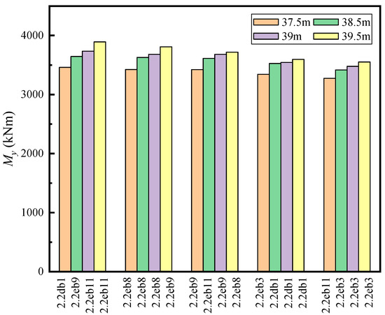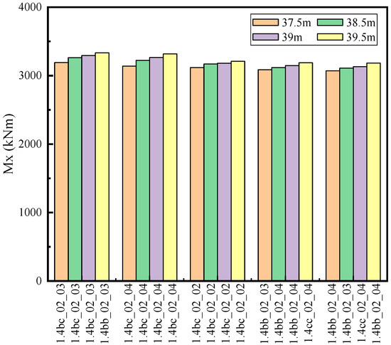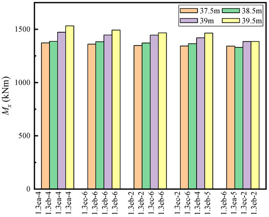 Similarly, the histogram of five cases with the highest Mx at hub in turbulence wind condition is shown in Figure 12. As shown in the figure, with the increase of blade length, Mx in each group shows an increasing trend. For the blade extension length of 1.5 m and 2 m, the load increases by 7.29% and 11.66%, respectively.