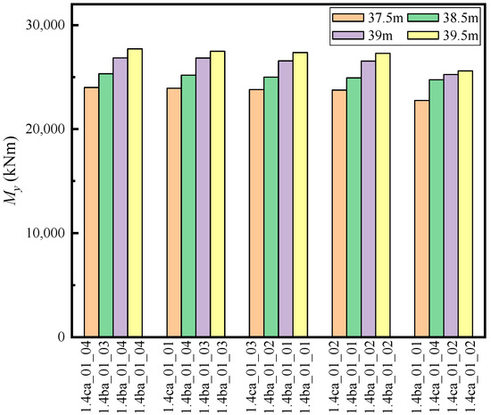 Ultimate load My at tower bottom. (The label of the load case: the first letter refers to wind speed, b for 11.5 m/s and c for 13.5 m/s; the second letter refers to yaw error and “a” for −8 deg; the middle number refers to wind direction change and 01 for positive direction change; the last number refers to starting azimuth angle, 03 for 60 deg and 04 for 90 deg).