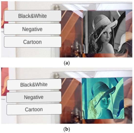 Lenna interactive AR object: (a) applying black and white image processing; (b) applying negative image processing.