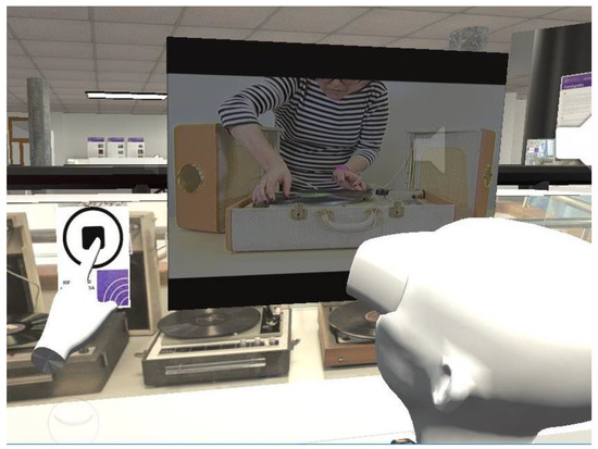 The 2015 and 2019 applications replicate the entire museum in a virtual environment. Using the Oculus Rift VR headset, users can navigate without any restrictions through the two museum floors. All the museum showcases and boards were modelled and included in the VR application. The idea is to virtualize the real experience to generate a presence sensation in the user. For this reason, in the VR environment, the AR application multimedia content is also included at the corresponding showcases. The AR targets were added on these showcases. Users, by touching the AR target with their index finger, can execute the multimedia content and interact with it in the same way they can in the real museum with the AR application (Figure 5).