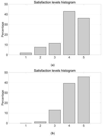 Satisfaction levels from 1 (lowest satisfaction) to 5 (highest satisfaction). Histogram in the different experimental groups: (a) traditional visit; (b) AR visit.