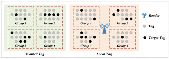 Assume that the tags in the interrogation region are divided into G groups, with no overlap between groups. Each group has a group ID as a unique identification for the group. According to the knowledge of traditional tag searching, the local tag set represents the set of tags in the interrogation region, denoted by L. We suppose that the reader only knows the number of local tags in group g, denoted by , and does not know anything else about them. We use W to denote the set of wanted tags, which represent the tags that we are interested in, and we want to check whether they are in the interrogation region. The reader not only knows the number of wanted tags in group g, denoted by , but also knows the IDs of the wanted tags in group g, . That is to say, the group state of the wanted tags is known, while the group state of the local tags is unknown. However, since the tag grouping is completed according to the actual situation before the tags are put into application, the reader has the knowledge of all group IDs. Moreover, the ultimate goal of tag searching is to determine the intersection of local tags and wanted tags in group g, and we refer to the tags in the intersection as target tags, represented by , i.e., . The reader can obtain the number of target tags in each group, denoted by , through performing the target tag estimation protocol. In addition, we refer to the tags in the local tag set except for the target tags as non-wanted tags, and the tags in the wanted tag set except for the target tags as non-target tags. Figure 1 briefly illustrates the tag searching problem in a multi-group RFID system.