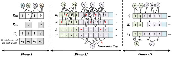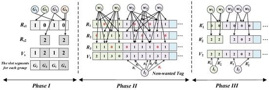 Phase II: Eliminate the interference of non-wanted tags in the group. First, the reader constructs a virtual filter vector by performing multiple hash operations on the wanted tag set. The reader initiates a query with the parameter , and , where indicates the frame length of this query, indicates the number of independent hash functions used in this query, and denotes the random seed in this query. The different hash functions in the query use the same random seed . Based on the slots selected by the wanted tags, the reader can construct a vector. Each bit in the vector corresponds to a slot. The slot with tag responses is denoted by 1 and without tag responses is denoted by 0. The reader sequentially performs l queries by random seeds to obtain l vectors. By synthesizing the information of these vectors, the reader can derive a filtering vector, denoted by . If the first bit of the first vector is 0, the first slot in the filter vector is represented by 1. If the first bit of the first vector is not 0, but the first bit of the second vector is 0, the first slot of the filter vector is represented by 2, and so on. If the first bit of all vectors is not 0, the first slot in the filter vector is denoted by 0. In summary, each slot in the filter vector indicates where the first “0” occurs. Then, the reader broadcasts the related parameters and filter vectors to the local tags in this group. The local tag performs hash operations in turn to select slots in for confirming whether it is the non-wanted tag. If the number in the slot it chooses is the same as the number of the random seed it uses, the tag is a non-wanted tag and will be deactivated immediately.