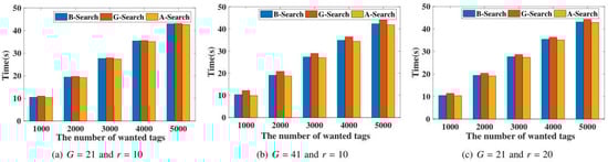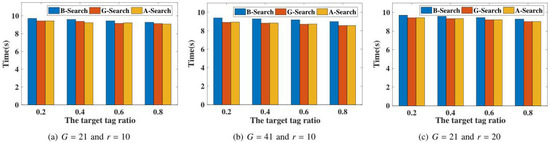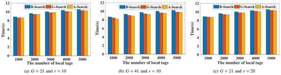 In Figure 5, we set the target tags ratio and the reliability requirement . Then, we explore its impact on the time efficiency of our protocols by changing the number of local tags in each group from 1000 to 5000 by 1000 in Figure 5a,c and from 500 to 2500 by 500 in Figure 5b. It should be noted that the number of local tags in each group here refers to the average number. Taking Figure 5a as an example, we set the number of groups , the group interval , and the number of wanted tags in each group . It means that there are 21 groups in the local tag set, and the number of local tags in these groups is changing from 900 to 1100 by 10. We set the number of groups , the group interval and the number of wanted tags in each group in Figure 5b, and set the number of groups , the group interval , and the number of wanted tags in each group in Figure 5c. As you can see, the number of local tags for each group in Figure 5b is different from the other two figures because the group number in Figure 5b is different from the other two, and we must ensure the total number of local tags is consistent overall. This also applies to the number setting of wanted tags. We find that A-Search performs the best, followed by G-Search, and B-Search ranks third. In Figure 5a, when the number of local tags in each group , the time cost of B-Search, G-Search, and A-Search equals 9.63 s, 9.43 s, and 9.39 s. The time cost of A-Search is 97.47% of B-Search and 99.57% of G-Search.