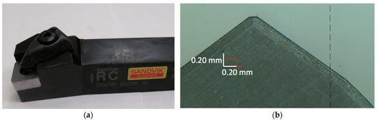 Experimental setup: (a) the holder with cutting insert; (b) insert CNGX1204L025-18AXA class 7015 with XCEL geometry.