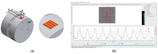 Measurement of the profile parameters: (a) scanned area on the bearing surface; (b) example of the screen during profile measurement, where red lines correspond with analyzed profiles on the scanned area.