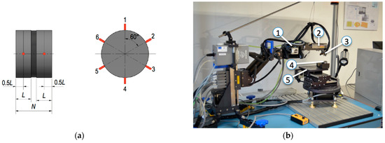 Measurement of the residual stress: (a) positions of the measuring points; (b) diffractometer Proto iXRD: 1—measuring arm, 2—X-ray lamp, 3—two detectors capturing the diffraction cone, 4—examined sample, 5—adjustable and rotating table.