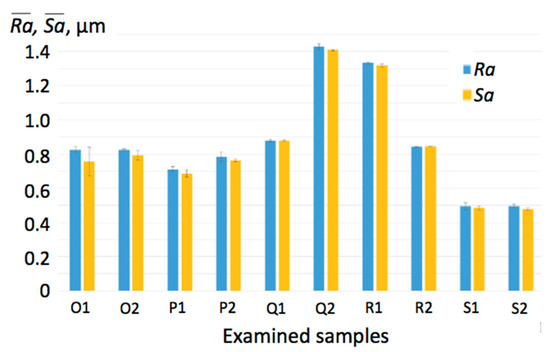Figure 7 presents a comparison of the profile parameters Ra obtained for different samples. Since the measurement was repeated for each sample, the average results are shown. In the diagram, 3D parameter Sa is presented, too. In general, there was no significant difference between 2D and 3D results, because the Sa parameter does not distinguish between peaks and valleys. In most of the bearing rings, the dispersion of the results was quite similar. A significant difference was seen in bearing ring O1, where 3D parameter Sa exhibited the largest dispersion of ca. 0.2 μm. This difference was due to the measurement of a larger area where some unevenness was noted, unnoticed by the profile measurement. These local deviations could have appeared either through mishandling of the sample or a manufacturing error.