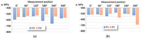 In general, compressive stresses are considered beneficial to the fatigue life of the machined part, its creep life, and resistance to cracking under stress corrosion, while tensile residual stresses are rather harmful [35]. Residual stresses σ on rings were compressive in all analyzed positions, i.e., all their values were negative. From the practical perspective of an inner surface of bearing, this nature of the stresses can be considered favorable in terms of the component functionality and surface integrity. Figure 10a shows the diagram of normal residual stresses for samples O1 and O2 machined with the WIPER tool. On the surface of O2, it is seen that the differences between the values obtained in the areas around the cylinder were less dispersed compared with O1. In the case of O2 samples, the difference between the lowest and the highest value was found to be only around 50 MPa, which is about 10%, while O1 samples exhibited dispersion of the results of ca. 125 MPa, which is close to 20%. In turn, comparison between P1 and P2 samples (Figure 10b) showed that residual stresses varied from 450 MPa up to 540 MPa in P1, while P2 exhibited dispersion varied from 500 MPa up to 690 MPa. The samples P1 and P2 were machined with the same WIPER tool, but at higher cutting speed.