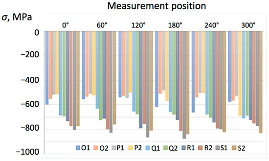 Based on the graph in Figure 11, it can be concluded that all examined replaceable cutting inserts have generated a certain strengthening of the surface layer, which was manifested by the formation of compressive normal residual stresses. Thus, it is possible to assume a sufficient service life of the machined part. It should be noted that the highest compressive normal residual stresses were identified in the surface layers machined with XCEL cutting inserts denoted as S1 and S2. Variations between individual measurements in different angular positions were found to be close to 100 MPa, which was approximately 12–15%.