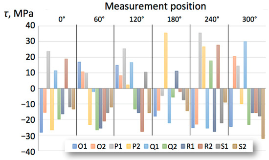 In addition to normal residual stresses, shear stresses τ were also identified in the surface layer of the bearing rings. Their values are presented in the diagram shown in Figure 12. The presence of shear stress represents the displacement of individual microstructural layers of the material, resulting from imperfect cutting or excessive stretching of the material during the machining process.