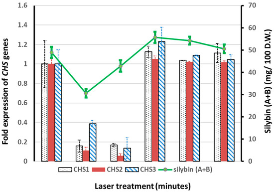- El-Garhy, H.A.S.; Khattab, S.; Moustafa, M.M.A.; Abou Ali, R.; Abdel Azeiz, A.Z.; Elhalwagi, A.; El-Sherif, F. Silybin Content and Overexpression of Chalcone Synthase Genes in Silybum marianum L. Plants under Abiotic Elicitation. Plant Physiol. Biochem. 2016, 108, 191–202. [Google Scholar] [CrossRef] [PubMed]