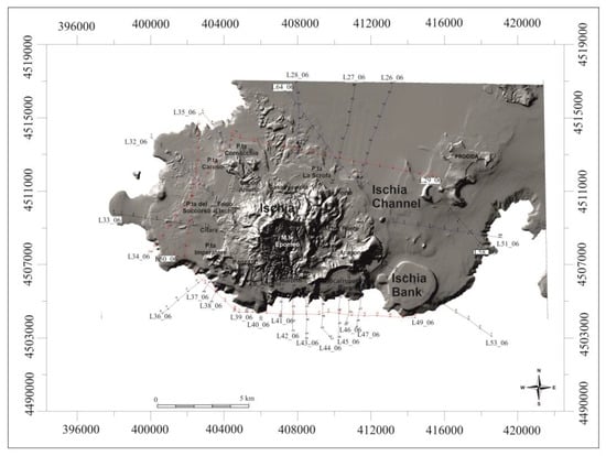 Ischia Digital Elevation Model with the location of the Sparker seismic profiles (modified after Sbrana et al. [56]).