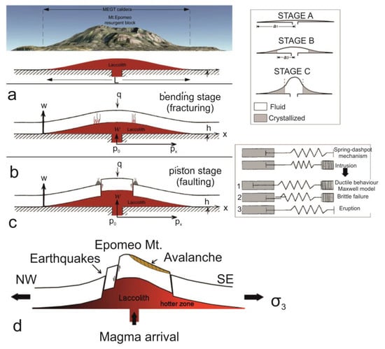 The laccolith hypothesis [30] initiates with the premise that the low crustal layer of Ischia (two kilometers in depth), which has experienced tectonic uplift and fracturing during the last 55 ky B.P., reposes above a laccolith (Figure 5). The increment in pressure of this magmatic body, which has displayed resurgence, was achieved with the placement of a resurgent block wide 4 × 4 km (Epomeo Mt), then further uplifted (piston phase, about 33 ky B.P. up to 10 ky B.P). The resurgence during the last two stages of quiescence (33–29 ky B.P. and 18–10 ky B.P.) and the ensuing eruptions are genetically related to the action of new magma [10]. During the resurgence, the island has been affected by gravitational instabilities in the southern sector (large debris avalanches) and by seismic activity in the northern sector.