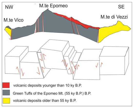 The caldera resurgence goes on in the central sector of the island in compatibility with fault systems N40–50W e N50–60E, highlighting the main regional tectonic structures [11,18] (Figure 6). The uplift occurred through the reactivation and the individuation of faults, resulting in the formation of down thrown blocks. Towards the NE, the bound of the resurgent area is not unsubtle, as well as along the shoreline, where beach deposits form marine terraces uplifted at several heights by faults having an E-W and a NW-SE trend. The westerly sector of the most uplifted block, corresponding to Epomeo Mt, is limited by high-angle reverse faults (Figure 6). The north-eastern and the south-western flanks of the resurgent area are confined by normal faults. The resulting lowland, which is the area in which the volcanism has been mainly concentrated during the last 10 ky, is connected westwards to Epomeo Mt. through uplifted blocks.