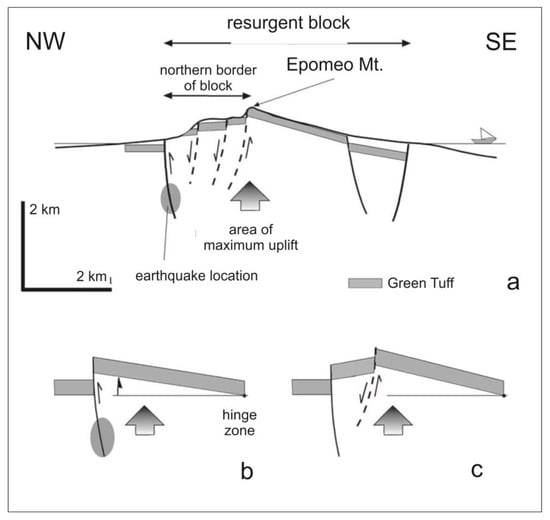 The kinetics of the resurgence of the Epomeo block can be stated by several proposals. All of them adopt as a trigger-off performance the entrance of a magmatic body at low depths [1,2,12,14,26]. Orsi et al. [12] have advised a performance of block resurgence, ruled by simple shear strengths, considering both the geological and volcanological constraints, as the arrangement of the volcanic edifices genetically concerned to the resurgence (Figure 6). This mechanism preserves the status of the magma uprising only in the sector of the resurgent area held in by an extensional regime, as detected in the calderas of Pantelleria and Campi Flegrei [12,14].