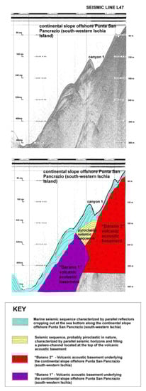 The environs of Southern Ischia are talked about through the geological interpretation of the seismic profile L47 (Barano Bay; Figure 9). The section tracks the “Scarrupata di Barano”, a steep coastal cliff and corresponding slope facing from the Barano sector of Ischia towards the Tyrrhenian Sea.