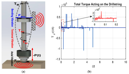 The total nonlinear torque on the drill string bit (TTb) is modeled as the sum of the total torque. Unlike the engine torque, the friction contact is modeled as a dynamic lateral and axial discontinuous dry friction contact (TRb) expressed using Equation (9) by: