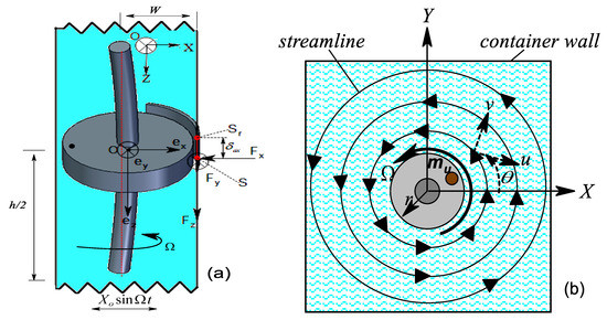 These results suggest that a net force is applied along the direction of excitation, according to Equation (36). The pressure distribution is symmetrical with respect to the reservoir in the perpendicular direction, canceling out the integration of the latter. There is no force in the direction of excitation produced by the pressure at the tank’s bottom. It should be highlighted that the introduction of notions of resistance forces for such liquid-level systems enables the straightforward description of their dynamic properties. Therefore, when considering the vertical shaft’s center coordinates along the X- and Y-axes: