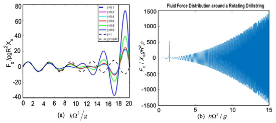 From Figure 6a, it can be seen that an underdamped fluid system between 0.1 and 0.9 gets close more rapidly than a critically damped or overdamped system. When increasing the damping parameters, the amplitude of the hydrodynamic force is exponentially increased away from the equilibrium position. The hydrodynamic forces acting on the rectangular container experience harmonic motion by overshooting the equilibrium position rapidly and exhibiting the fastest unstable response. Overdamped hydrodynamic forces are sluggish in responding to any damping increment, as observed by the dashed curves. However, Figure 6b presents the dependence of fluid forces on the lateral excitation frequency. From the foregoing analysis of the hydrodynamic forces, the fluid force is either critically damped or overdamped monotonically at the same magnitude. The downhole vibration of a drill bit, such as axial, lateral, and torsional vibrations, can cause premature tool failure. To optimize the drilling performance and extend the life of the drilling tools, controlling or mitigating downhole vibration is essential [19,20]. The natural frequencies of the five DoF kinematic chain are as follows: f01 = 0 Hz, f02 = 4.0756 Hz, f0X =53 Hz, f0Y = 53 Hz, and f0Z =187 Hz. The fluid drill string parameters used in this study are listed as indicated in Table 1.