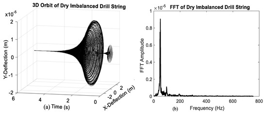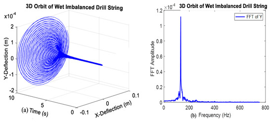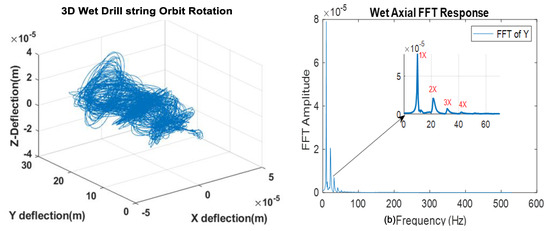 From the FFT characteristics (Figure 15b), it is evident that the resonant frequency is higher than in the case of the imbalanced drill string operating in water in Figure 15a. The experimental results demonstrate that, during start-up, the lateral trajectory of the drill string increases gradually, and its circular orbit consists of mixing two harmonic paths of different frequencies (Figure 15a and Figure 16a). The orbital path rotates at a considerably lower amplitude (note the different magnitudes in the X- and Y-axes in the figures after immersion) as shown in Figure 15b and Figure 16b.