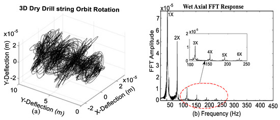 Figure 7b shows a drop in the torsional deflection signal, which keeps on gradually attenuating until the torsional vibration stops. Due to the nonlinear effects inherent in the drill string system problem, the oscillations do not grow infinitely; rather, during a collision, it is found that, in the case of deterministic friction without water, the component corresponding to the circumferential vibrations of the drill string disc is always dominant, and random friction creates impulsive forces which excite the transverse mode (Figure 7a). Figure 8 and Figure 9 are an expanded view of the spectrum around the drill string speed up to two orders with the appearance of noise peaks in specific areas of the spectrum. The drill string hump of energy just around 66.3135X and 132.627 orders in the air is possibly a structural half and critical resonance (Figure 8b). Contrary to the air medium, the structure in a fluid environment in Figure 9b shows an imbalanced fault characteristic frequency. The observation of the envelope spectrum in Figure 9b demonstrates a reduction in the vibration amplitude resulting in the soft fluctuation of the system. The vibration changes drastically in magnitude as a result of fluid pressure. Common changes in patterns (peaks, harmonics, noise, and orbits) can be observed. The presence of fluid reduces the number of peaks from the fundamental frequency and increases progressively after the amplitude of fluctuation from 0.84 × 10−4 m to 1.11 × 10−4 m in the inviscid fluid. The vibration responses displayed by the orbit patterns are distorted and cease to be pure harmonic signals, as shown in Figure 8a, contrary to Figure 9a, wherein the immersed fluid in the shaft center orbit in the X and Y directions are multi-circular circles.