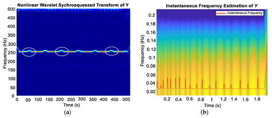 The corresponding estimated frequency spectrum (red line) extracted by the NWSST method shown in Figure 13b contains a regular breaking point that involves the damping effect of the fluid upon shock contact. In Figure 14a, the dominant frequency of the resonance mode of the drill string can be observed at a considerably lower frequency. If the evolution through time of the peak at 250 Hz is followed, it can be seen that there is no longer an oscillation around a defined frequency. However, the curve (circled area) shows sudden periodic jumps above that of the frequency resonance as if the behavior of the system changed from one mode to another, which corresponds to the minimized chaotic point observed in Figure 13a. In the presence of hydrodynamic forces, the rubbing intensity observed in Figure 13 is attenuated, but the nonlinear phenomena of the fluid introduced a disturbed cascade of peaks throughout the vibration. The IF of the imbalanced system under the frictional impact of the phenomenon is relatively obvious, as observed in Figure 14b, where a series of peak frequency components are aperiodically distributed by irregular low spectral lines representing the contact permanent. As fluid forces and frictional impacts occur, the wavelet scalogram gives a good display of time in the frequency region with an improved analysis of the time-frequency resolution; higher frequency components appear and make it possible to identify the time of occurrence, and the frequency of the friction caused impacts and a sharp decrease in the amplitudes of noiseless extracted IF components, which reveal clearly the time interval between successive high pulses.