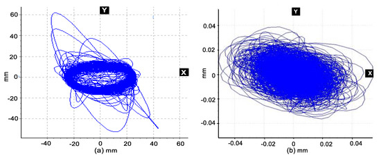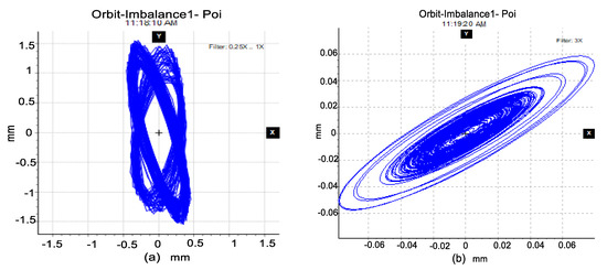 Experimental orbit response of the imbalanced drill string in fluid (a) without water and (b) with water.