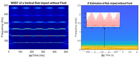 Time–frequency map of imbalanced rotor-casing rub; (a) NWSST response; (b) IF response.